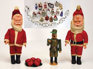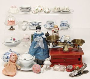 schönes Konv. Puppenstuben-Ausschmückungsteile, meist Zinn, Gefäße, Krüge, kl. Tischchen, Kerzenständer, einige Nippes-Figuren, u. Pressglasschalen, 2 Steinkrüge mit Zinndeckel, u. anderes, bitte Besichtigen