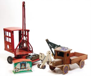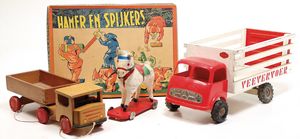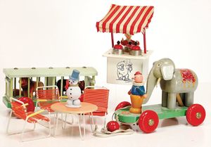 Konv. Holzspielzeug, gem. W. Made in Germany, Zirkuswagen mit Clown, Elefant u. Raubtierwagen, 1 Eisstand, gem. Koho, runder Tisch mit 3 Stühle, 1 Biegepuppe