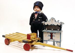 Ursel, 70 cm, Tortulon, Kurbelkopf, blaue fest eingesetzte Glasaugen, bewegl. Arme u. Beine, sehr guter Zust., im Orig.-Kart., alte Kleidung