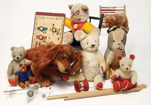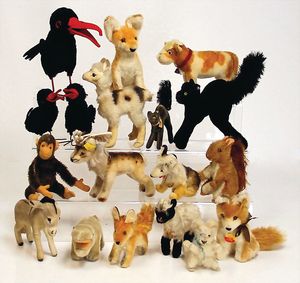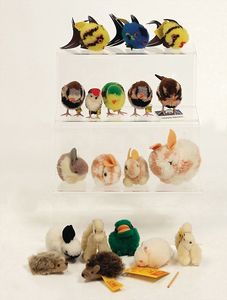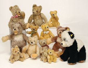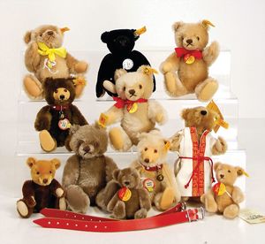 Konv. STEIFF, 9 Kalender, 90er Jahre, Prospektmaterial, Princess Spielteppich, einige Werbeaufkleber, 80er Jahre, 1 Replika Klassik-Bär, 1938, ohne Knopf mit Schild