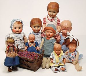 Fundkiste, Puppen, Biskuitporzellan-Puppe, gem. Welsch, 32 cm, einfacher Masse-Stehkörper, 1 Puppe Kunststoff, Schidkröt Bärbel, 29 cm, Celluloid-Mädchen, 2 Masse-Puppen