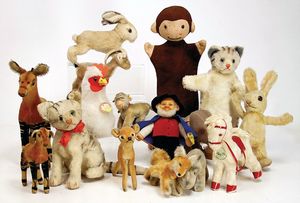 Konv. 10 Handspielpuppen, bespielt, teilw. mit Knopf oder Schild