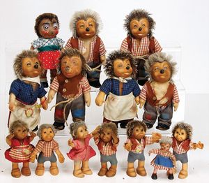 Konv. Puppen, meist Schildkröt, Celluloid, Tortulon, Kunststoff, 8 Teile, Hans u. Bärbel Schildkröt, Replika
