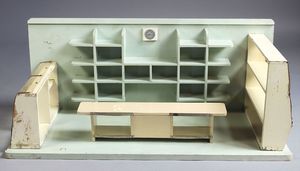 Puppenstubenküche, ca. 1910, 95 cm breit, 52 cm hoch, 2 Fenster, innen alte Bemalung, außen 1 x überstrichen, möbliert, reichh. Zubehör, mit Herd