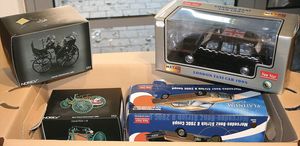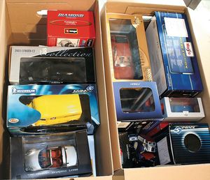 2 Kisten, ca. 20 Modellautos, darunter auch einige leere Kart., diverse Maßstäbe wie 1:18, 1:43, teils ohne Orig.-Kart., Hersteller wie Maisto, Collection Prestige, Solido, Modelle wie Peugeot, Corvette, einige Roller u. Motorräder, sonst guter Zust.