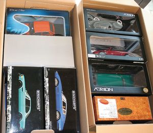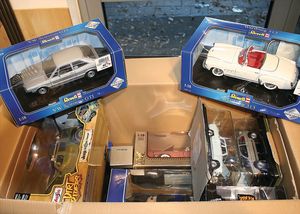 Konv. bestehend aus 2 Kisten, ca. 20 Modellautos, Maßstab 1:18, teils im Orig.-Kart., teils ohne Kart., Hersteller wie Revell, Norev, Modelle wie BMW, Mercedes SL, guter Zust.