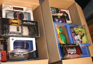 2 Kisten, mit 12 Modellautos, teil bespielt, teils guter Zust., alle im Orig.-Kart., einige Kisten ohne Inhalt, diverse Maßstäbe wie 1:18, 1:72, 1:55, Hersteller wie Maisto, Motormax, Hot wheels, Marken wie Maserati, BMW 745i, Peugeot
