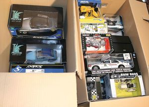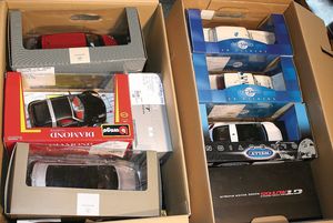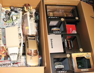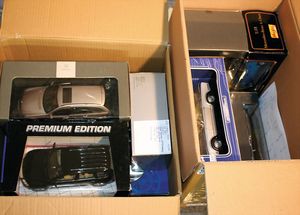 2 Kisten,, ca. 30 Automodelle, darunter auch leere Verpackungen ohne Inhalt, Marken wie Burago, Valley, Motormax, Modelle wie Porsche GT 3, Ford Street Car, alle im Orig.-Kart., guter Zust., diverse Maßstäbe wie 1:18, 1:24, 1:43