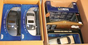2 Kisten, 14 Modellautos, diverse Maßstäbe wie 1:18, 1:24, Hersteller wie Maisto, Revell, Ricko, Modelle wie Mercedes Benz, Smart, VW, alle im Orig.-Kart., guter Zust.