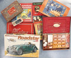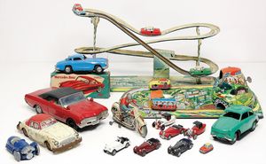 Konv. Blechspielzeug, Technofix Seilbahn, nicht komplett, 1 Achterbahn, Blech, Justra Mercedes 190 SL, stark bespielt, Flugrost, 1 Mercedes 300 SL, Japan, Blech, Batterieantrieb, guter Zust., Orig.-Kart., einige Technofix Fahrzeuge, 1 Motorrad Technofix 255, Rostfehler an 1 Rad, 1 3-rädiger Sportwagen, Guss, Bodenplatte Zinkpest, 1 Kleinwagen Kunststoff, restaurierungsbedürftig, einige Modellautos mit Fehlstellen, 1 Fahrzeug, Japan, 28 cm, Batterieantrieb, guter Zust., techn. nicht gepprüft, schönes Händlerkonv.