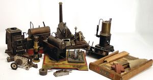 Konv. Fundkiste, Eisenbahn, Märklin, Bahnhof, 50er Jahre, 48 cm breit, 1 Bahnhof Karl Bub, 30er Jahre, 2 kl. Schlepptenderlokomotiven, Spur 0, ,Uhrwerk ohne Tender, einige Leerkartons