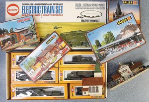 Fundkiste, einige Faller Häuser, teilw. gebaut, teilw. im Orig.-Kart., dazu 1 H0 Militärset elektric train set, H0, USA; sehr guter Zust., im Orig.-Kart., bitte besichtigen