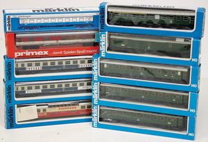 Konv. bestehend aus 10 Personenwagons, 4-Achsig, H0, guter-neuwertiger Zust., Orig.-Kart, diverse Nummern wie 4139, 4131, darunter Primex Speisewagen, Spur H0, Orig.-Kart., guter Zust.