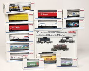 H0, Konv. Güterwagen, darunter 4617, 4571, 4663, 4630, 46969 Insider, 4618, 7 Teile, dazu 5 Personenwagen, 41371, 41351, 4064, 4215, alles neu im Kart.