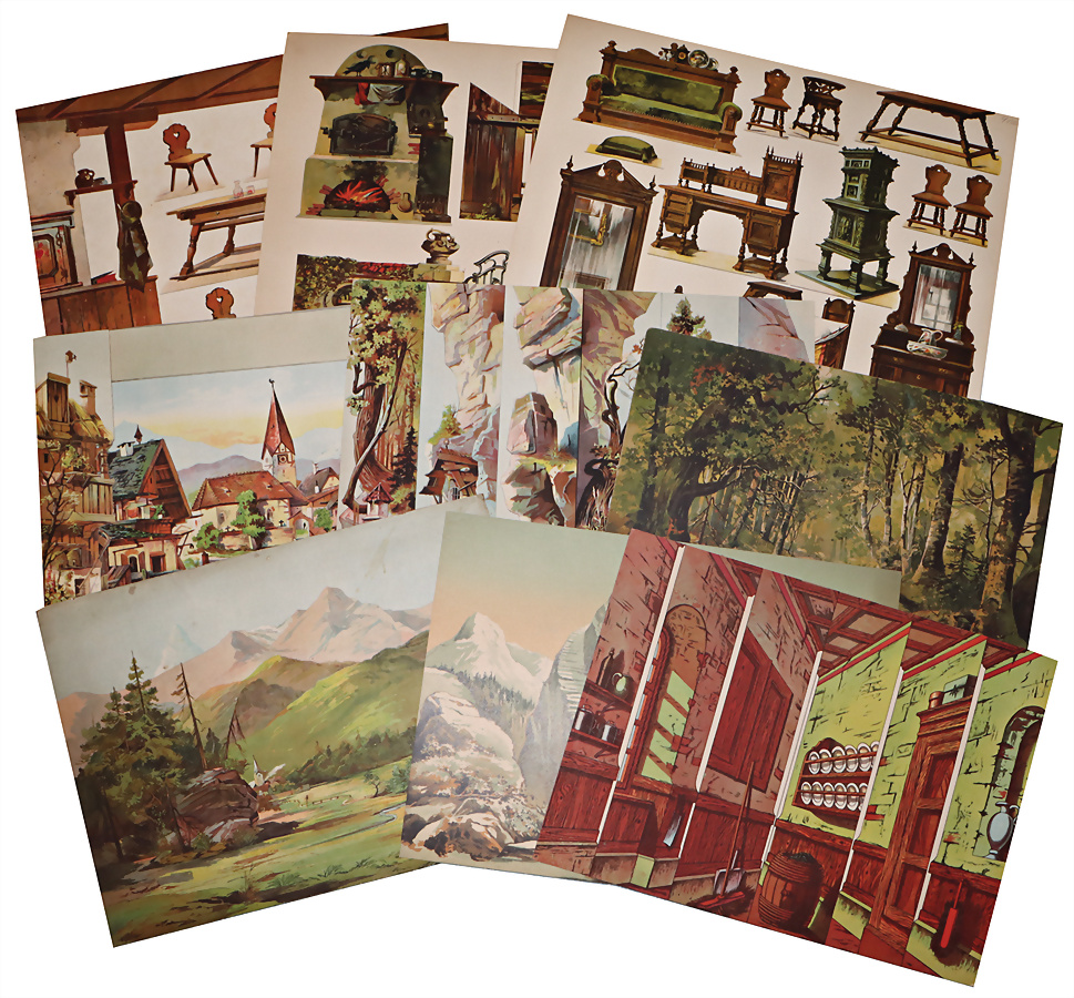 Meist Schreiber, Kulissenteile, Hintergründe, 18 Teile, Bögen auf Karton geklebt