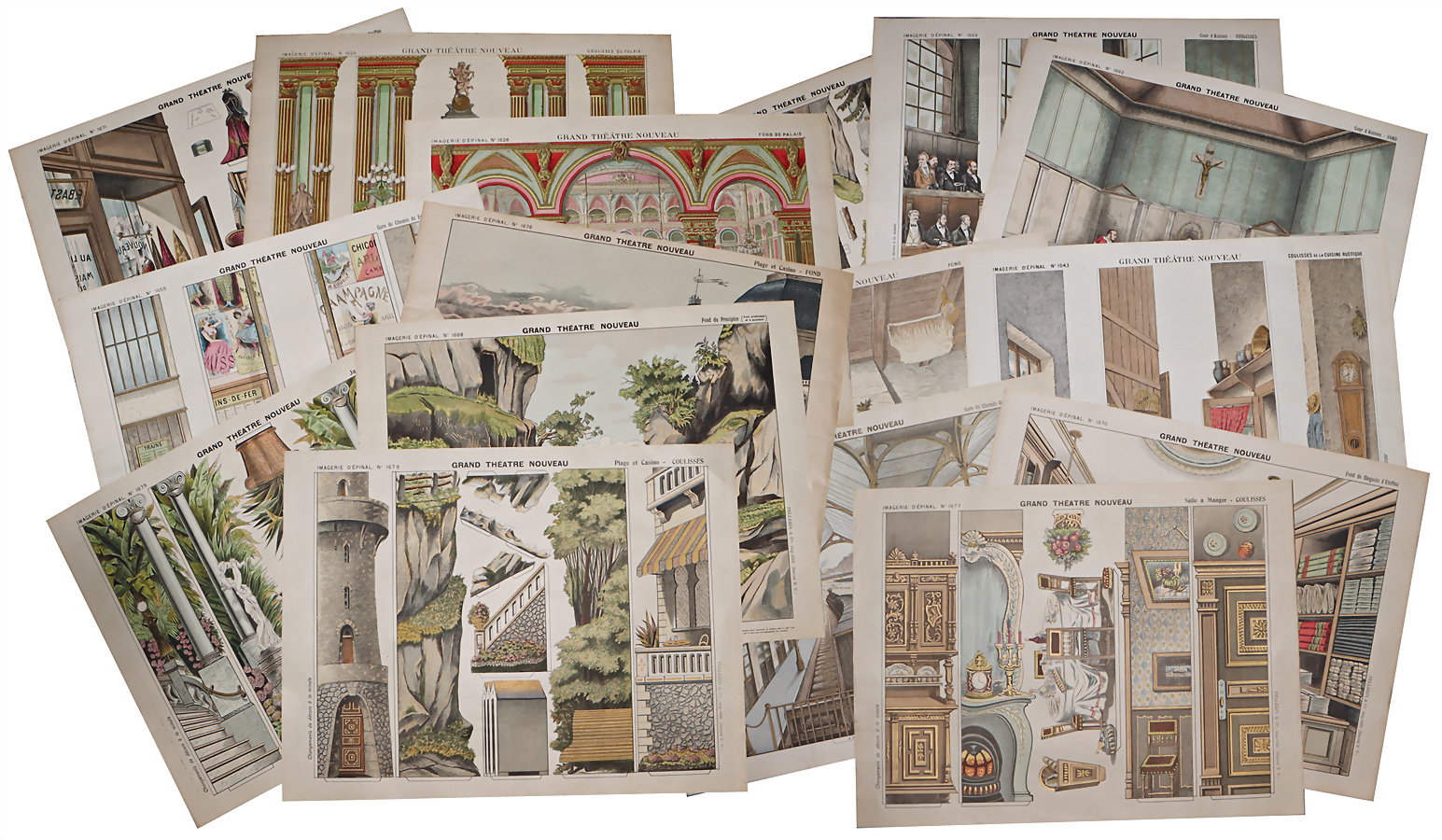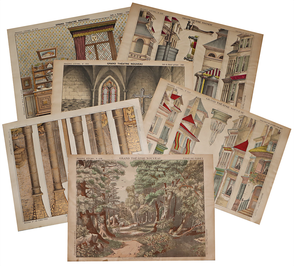 Konvolut Papiertheater, Kulissen und Hintergründe, Rögen, Frankreich, Grand Théâtre nouveau 1678, 1655, 1628, 1629, 1651, 1670, 1677, 1656, 1658, 1643, 1642, 1663, 1662, 1669, 1679, 1668, 1675, meist sehr guter Zustand