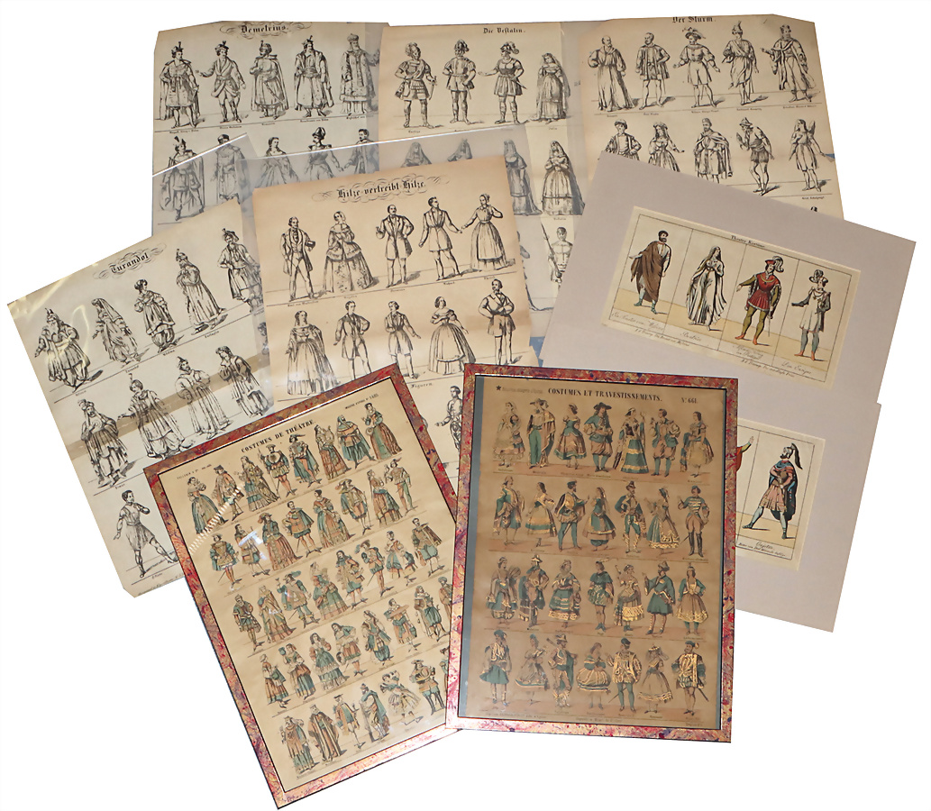 Papiertheater, Bögen, Figuren, und Kleidung, Costumes et travestissements., 661, Gold, handkoloriert, 1480, Costumes de Théâtre, Theater-Kostüme, Druck, handkoloriert, in Paspatou, einige Blätter Figuren, Druck schwarz-weiss, meist guter Zustand, teils Fehlstellen am Rand