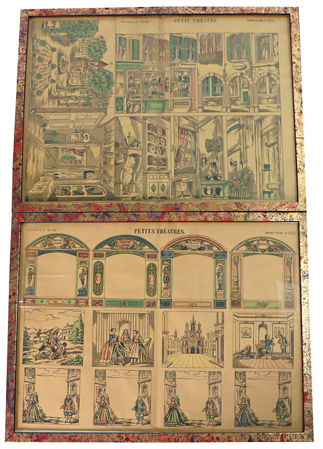 Petits Théâtres, zwei Papiertheater-Bögen, 1515, 1514, Front, Hintergründe, Kulissen, gerahmt, ein Blatt mit Einriss, sonst gut