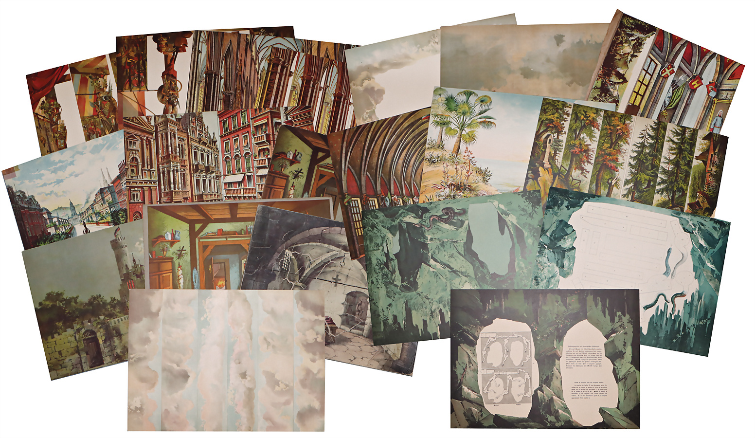 Großes Konvolut Schreiber, Hintergründe und Kulissen, auf Karton geklebt, 26 Teile, meist guter Zustand, teils kleinere Fehlstellen