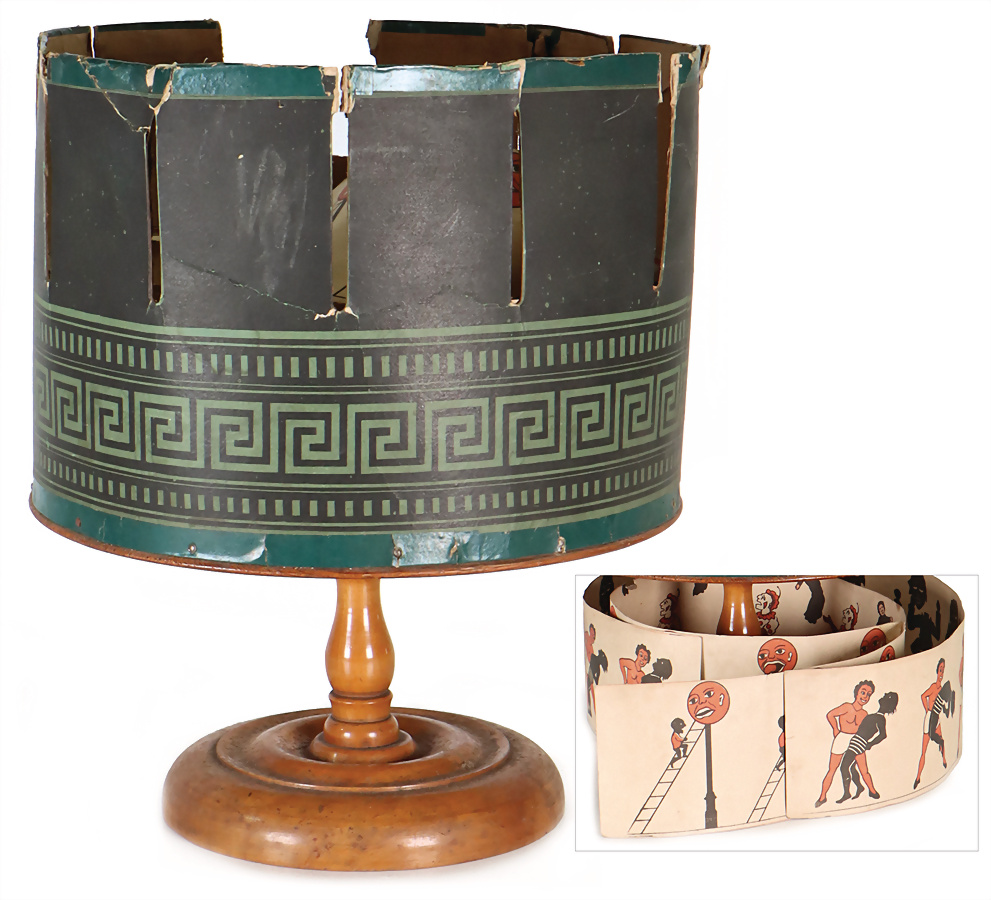 Zoetrop, ca. 1860, D: 27 cm, H: 34 cm, 1 Seitenumrandung weggebrochen, mit einigen Bildstreifen, schönes Teil zum Restaurieren
