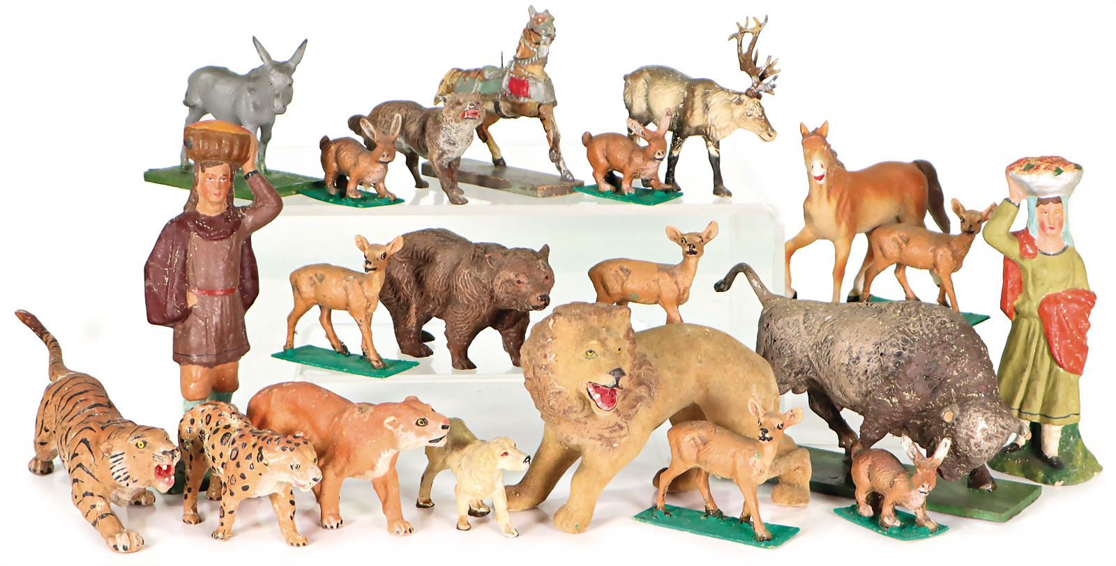 Konv. Masse-Tiere, Löwe, früh, Tuchstaublackierung, 9,5 cm, für Menagerie, 2 Masse-Figuren, 15,5 cm, einige Wildtiere, ELASTOLIN u.a., teilw. auf Pappsockel geklebt, 1 Pferd für Ritterfigur, Zust. 2-3