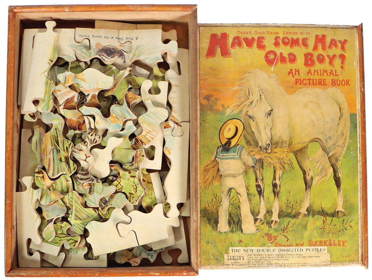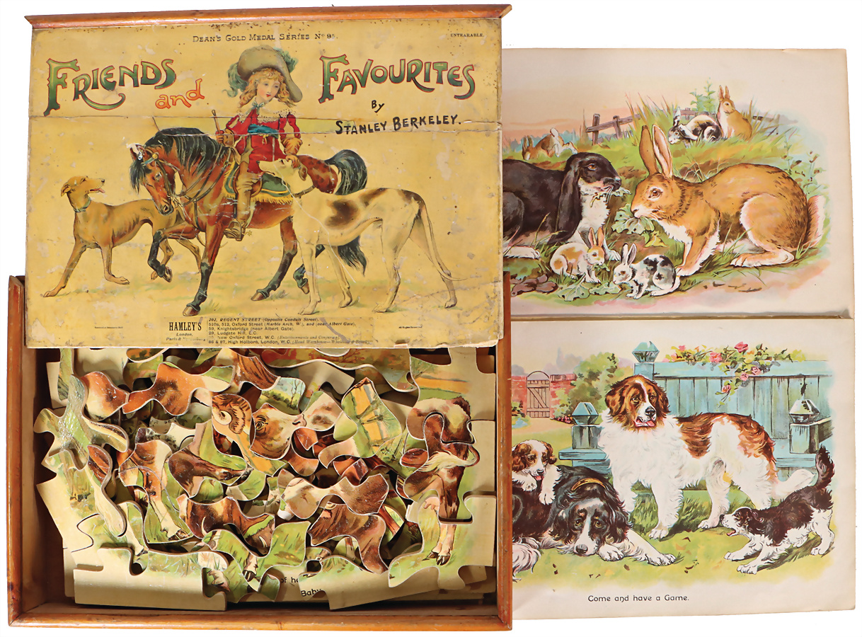 Puzzle, England, Dan’s gold medal feries Nr. 65 friends and favourites hamley’s London, orig. Kart. mit bunt lithogr. Deckbild, Deckel 1x gerissen, mit Anleitungblättern, auf Vollständigkeit nicht geprüft, ca. 1890