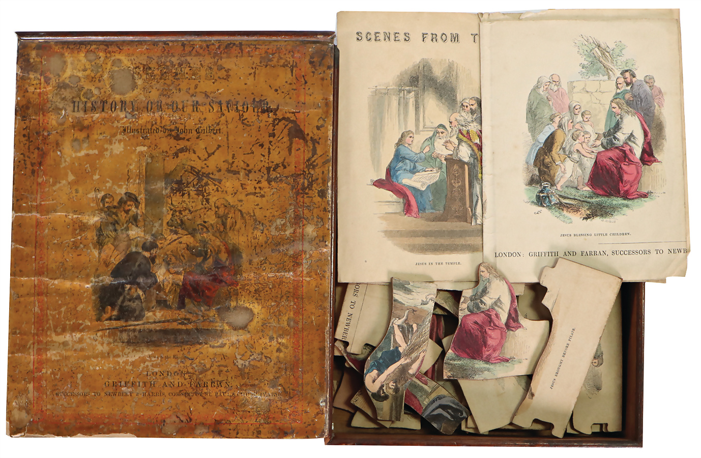 Puzzle, Biedermeier, England, handkoloriert, religiöse Darstellungen, mit Vorlageblättern, orig. Holzkiste mit bunt lithogr. Deckbild, altersbed. etwas verschlissen, auf Vollständigkeit nicht geprüft