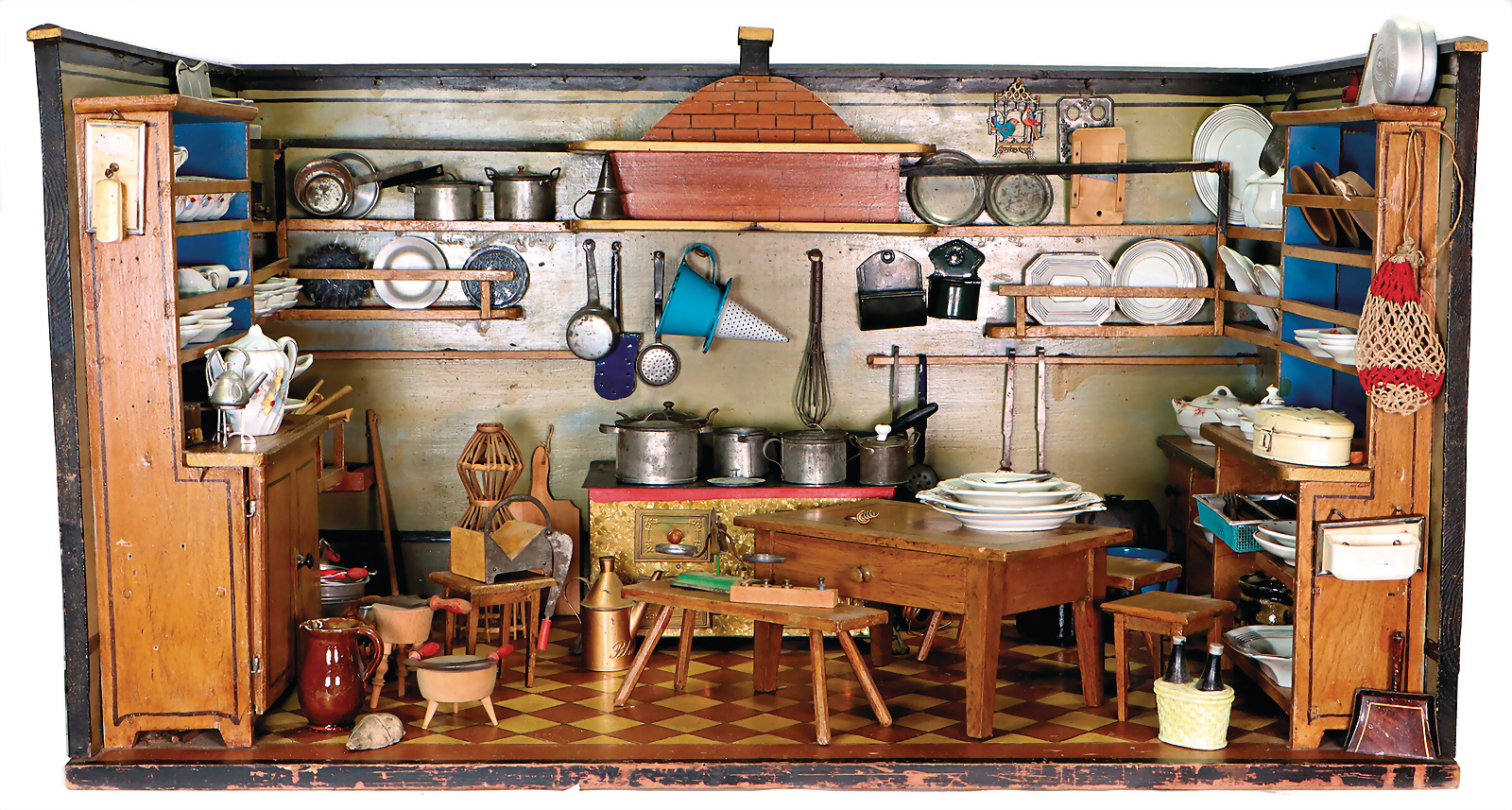 Puppenstuben-Rauchfangküche, B: 92 cm, H: 49 cm, T: 54 cm, Rauchfang, fest eingebaute Regale, Waschtisch, sehr schöne Orig.-Bemalung, innen u. außen, ein paar Zubehörteile