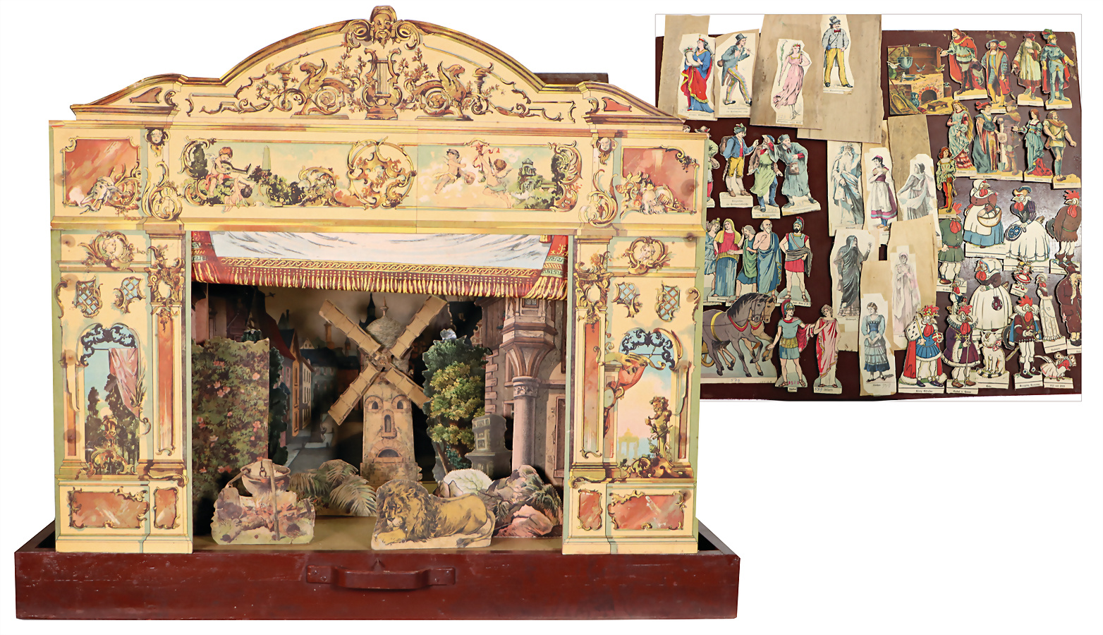 Papiertheater, B: 80 cm, T: 66,5 cm, H: 74 cm, Korpus mit Vorhang, Kulissenteile, reichhaltig Figuren und Zubehör, in Szenen sortiert, Versandaufwand beachten, besser Selbstabholer