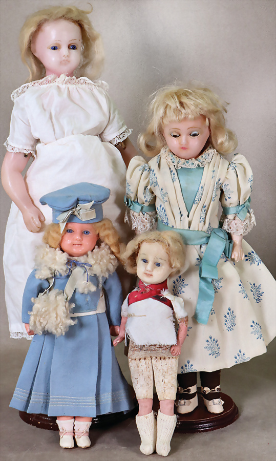 Konv. Puppen, Papiermaché, Wachs überzogen, 36 cm, braune Schlafaugen, geschl. Mund, Mohair-Perücke, wurde nicht entfernt, bitte Transportrisiko für die Augen beachten, Stoffkörper, Masse-Unterarme, Wachs-Brustblattkopf-Puppe, unprofessionell auf einfachen Stoffkörper montiert, Wachs überzogene Papiermaché-Puppe, Spannungsrisse am Hinterkopf, Stoffkörper, Wachs überzogene Arme u. Beine, Wachs-Brustblattkopf-Puppe, 45 cm, fest einges. blaue Glasaugen, einges. Mohair, Wachs-Arme u. –Beine, Stoffkörper