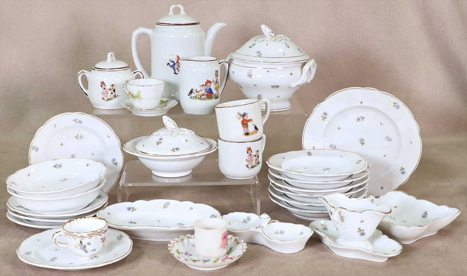 Kinder-Speiseservice, Porzellan, Veilchenmotiv, 6 tiefe, 5 flache Teller, D: 12 cm, Suppenschüssel, Deckelschale, Schalen, Sauciere, dazu einige Teile Kaffeeservice