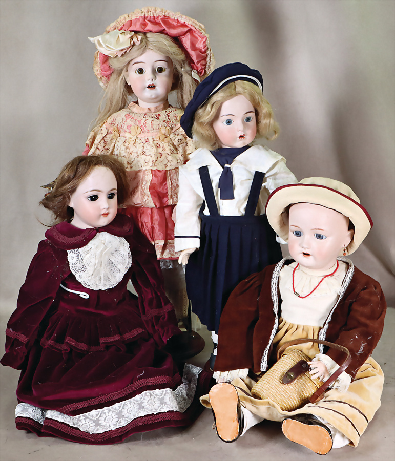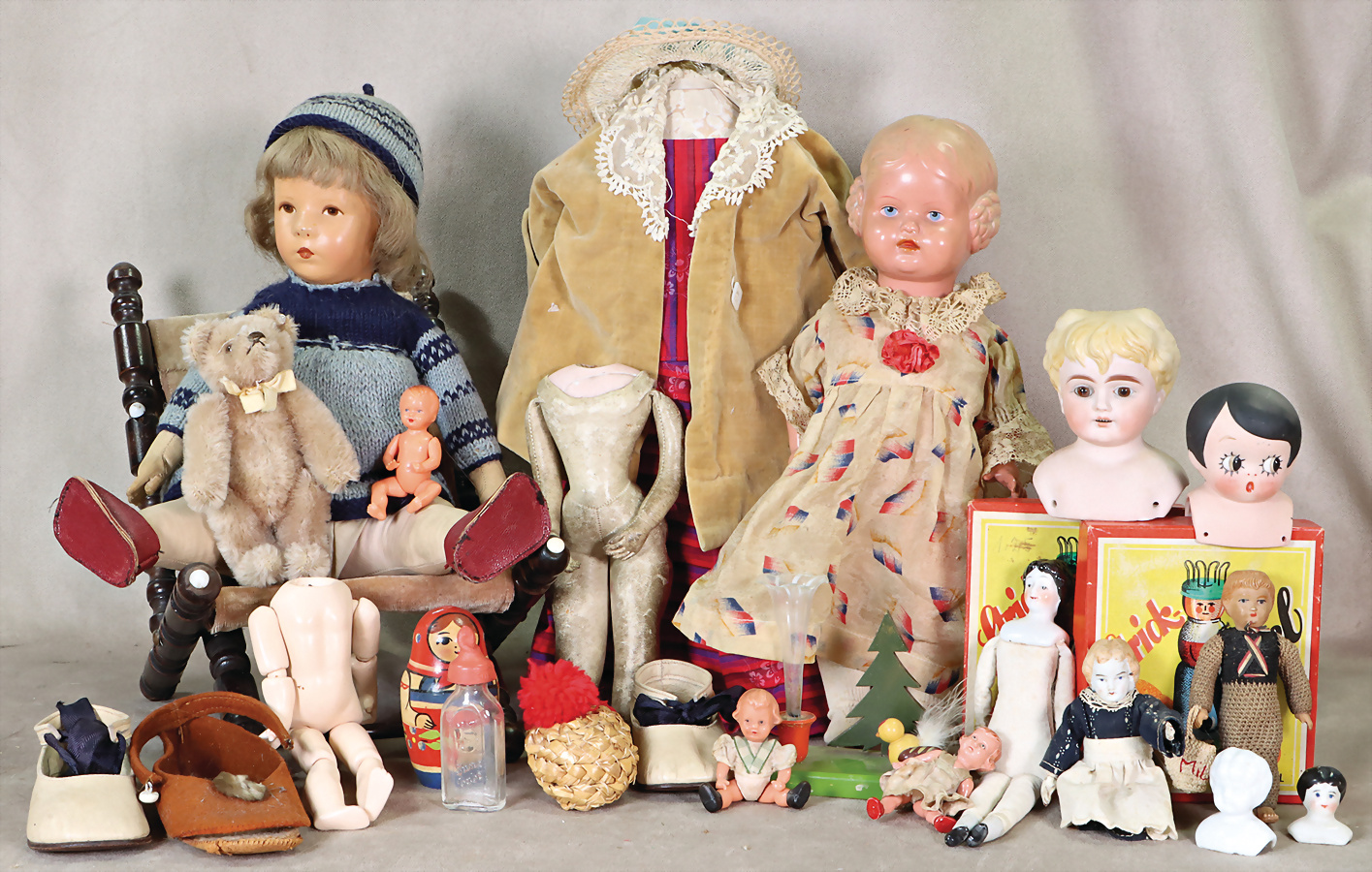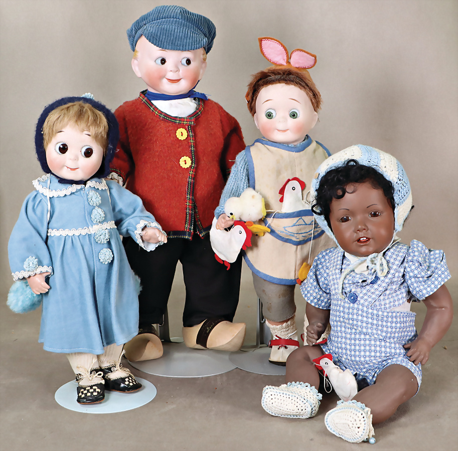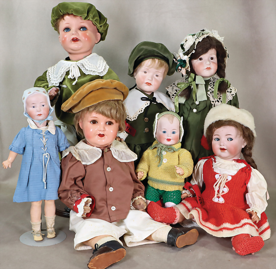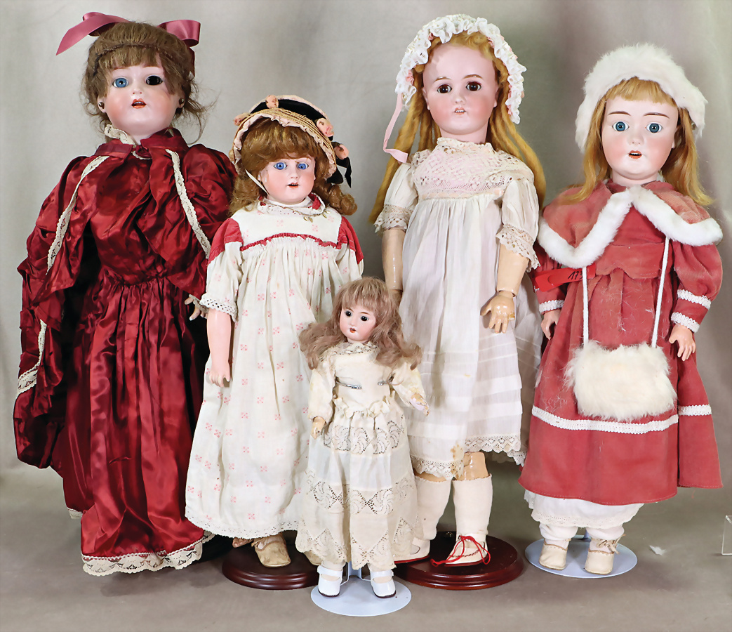 Konv. Puppen, KÄMMER & REINHARDT, vorne gekennzeichnet mit W, 62 cm, Kopf gebrochen u. geklebt, 1 Auge eingefallen, ursprünglich Kopfdrehmechanik, Körper unschön ausgebessert, SIMON & HALBIG, Porzellankopf-Puppe, Kopf Reproduktion, Porzellankopf-Puppe, 64 cm, braune Schlafaugen, off. Mund, oben Zähne, Kinngrübchen, Gliederkörper, Kopf beim Brennen aufgeplatzt, kl. Riss davon ausgehend, Porzellankopf-Puppe, 36 cm, Kurbelkopf, fest einges. Glasaugen, Riss am Kopf, Perücke wurde nicht entfernt, Porzellan-Brustblattkopf-Puppe, Kopf gebrochen u. geklebt