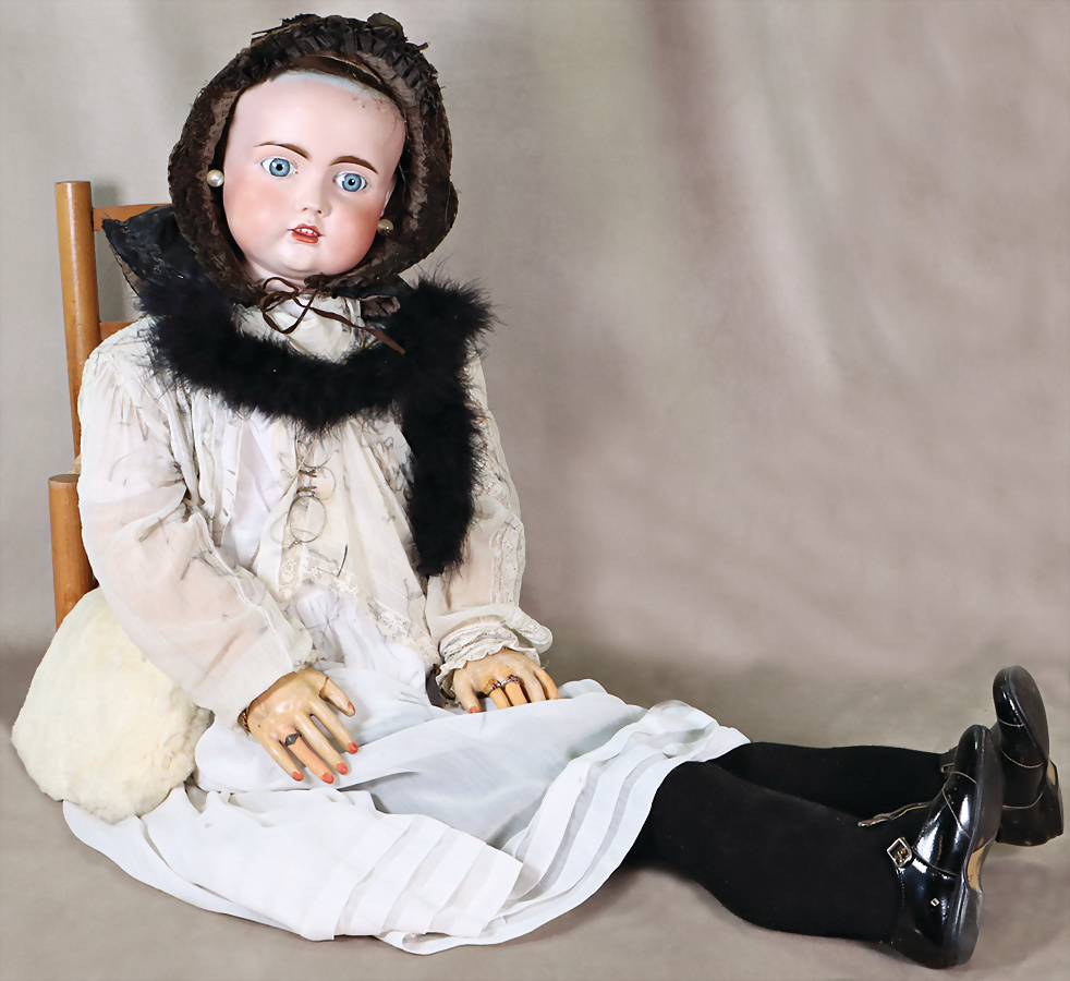 Porzellankopf-Puppe, gem. 250, 111 cm, extrem außergewöhnliche Gr., blaue nachtr. fest einges. Glasaugen, 1 Augenlid minim. ausgebessert, off. Mund, oben Zähne, Zunge, Gliederkörper, mit langen Oberschenkeln, Masse-Abplatzer am Körper, Körper bespielt, ein paar Finger geklebt, Echthaar-Perücke später, Puppe muss neu aufgezogen werden