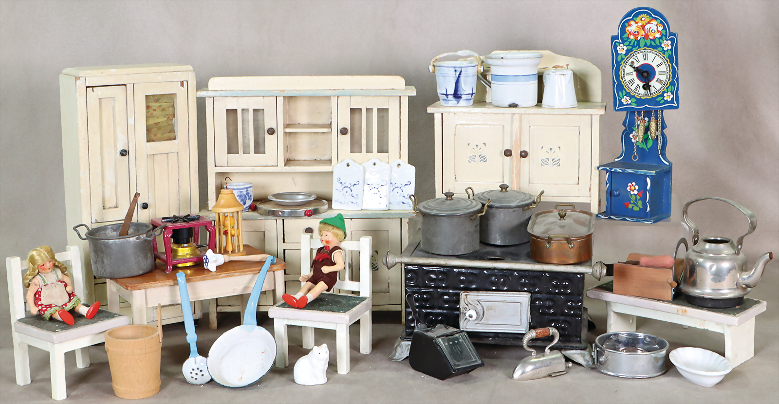 Puppenküchen-Ausschmückungsteile, Schrank, H: 27 cm, Kommode, Tisch, Besenschrank, 28 cm, Herd, ohne Schornstein, ohne Töpfe, reichh. Zubehör aus untersch. Zeit