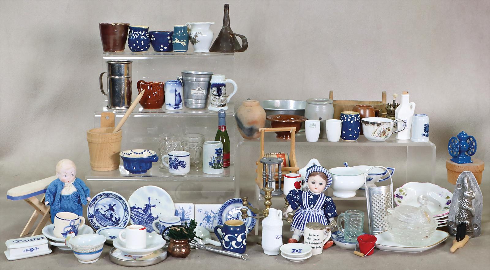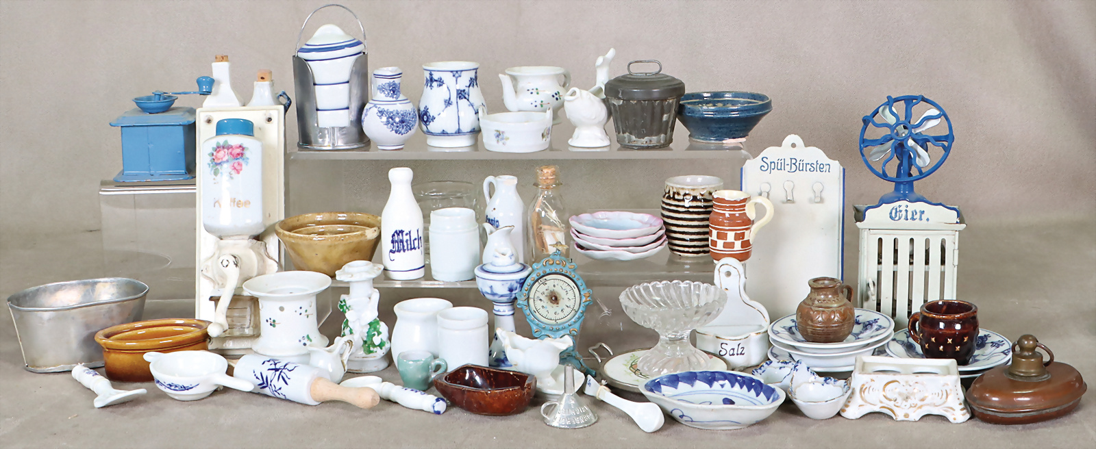 Gr. Konv. Puppenküchen-Ausschmückungsteile, Porzellan, Blech, Keramik, untersch. Zeit, darunter Essensträger, Wandkaffeemühle, Eierschrank, Blech, 9,5 cm