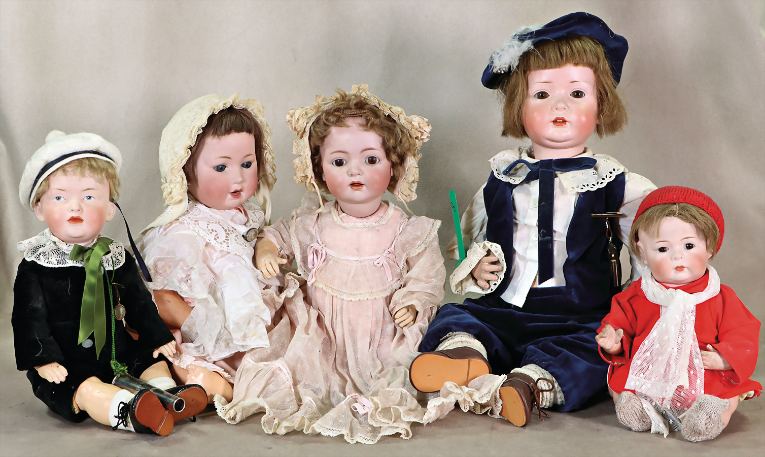 Konv. Puppen, KÄMMER & REINHARDT, 114, Reproduktion, KÄMMER & REINHARDT, 114 mit Glasaugen, Reproduktion, HEUBACH, Kind mit anmodell. Haube, Reproduktion, 2 Masse-Puppen, Baby, SONNEBERG, 51 cm, Schlafaugen, KÄMMER & REINHARDT, 126, Kopf gebrochen u. geklebt, 1 Baby-Puppe, Replica