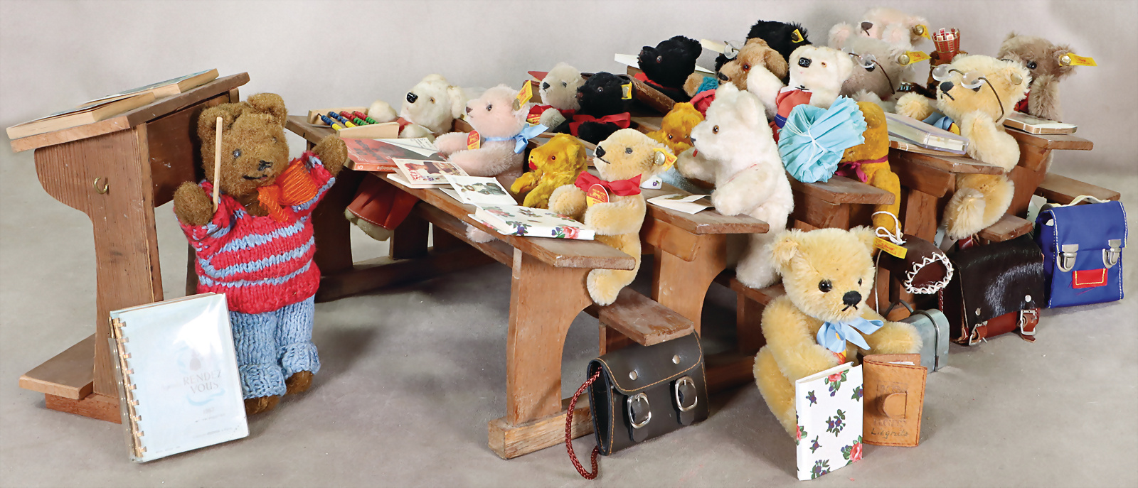 Bärenschule, Schulbänke, 47 cm, Lehrerpult, Bären, untersch. Zeit, untersch. Hersteller
