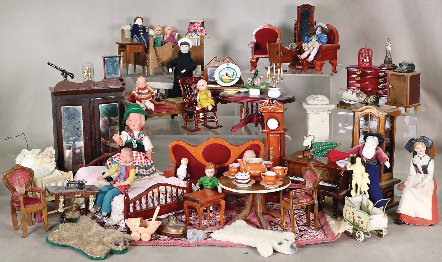 Puppenstuben-Möbel, Biedermeier, Sofa, B: 18 cm, Vitrinenschrank, untere Schublade fehlt, 17 cm, Schrank Sekretär, Kommode, Tisch, Sockel ergänzt, einige Stühle, Sessel, Spiegel, Puppenstuben-Puppe, 13 cm, insges. etwas eingestaubt, kl. Fehlstellen