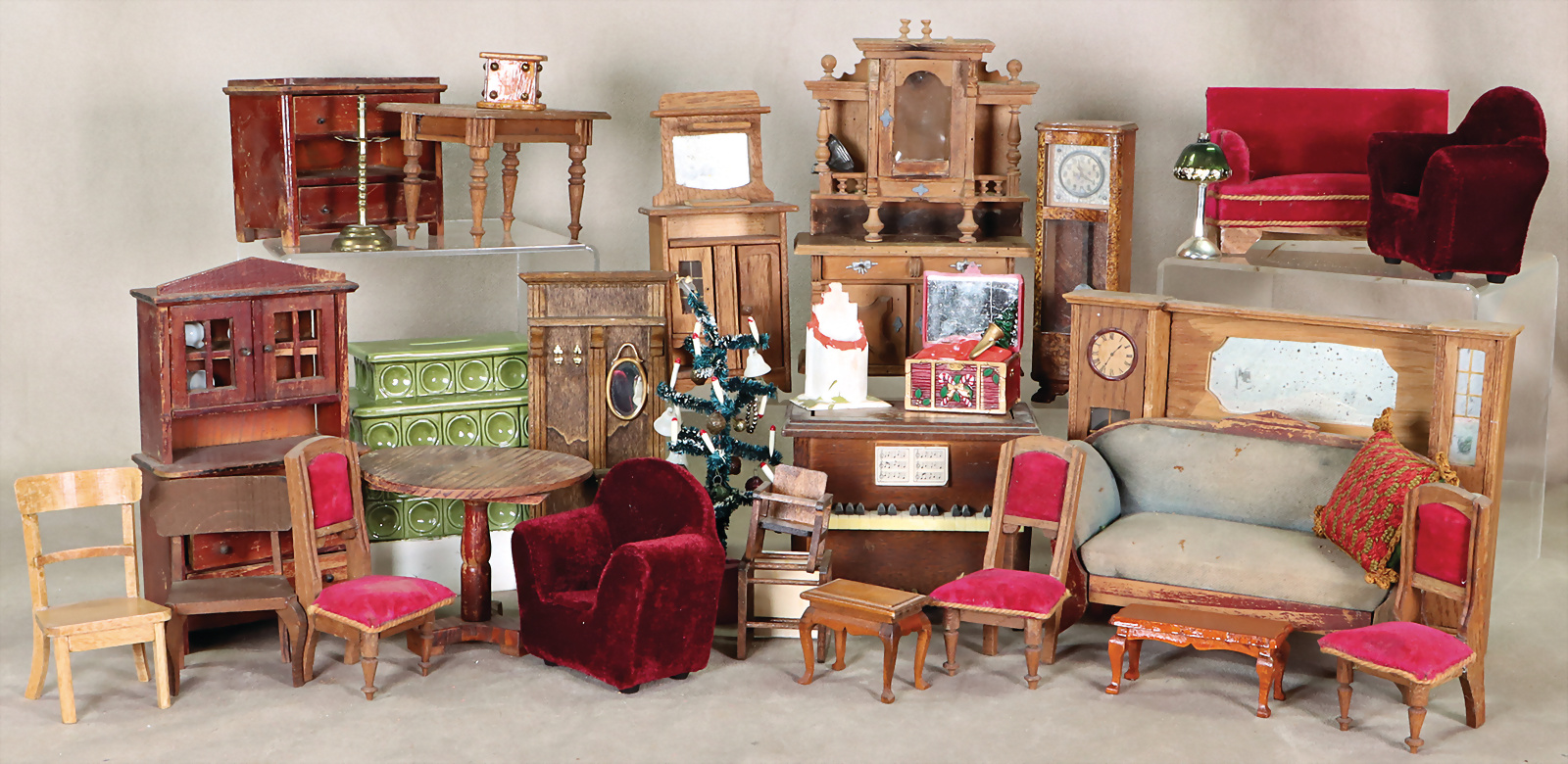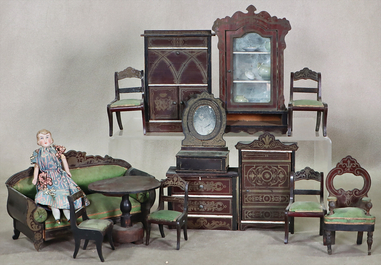Konv. Puppenstuben-Möbel, 1900-neuer, teils guter Zust., teils Fehlstellen, oder zum Restaurieren, reichh.