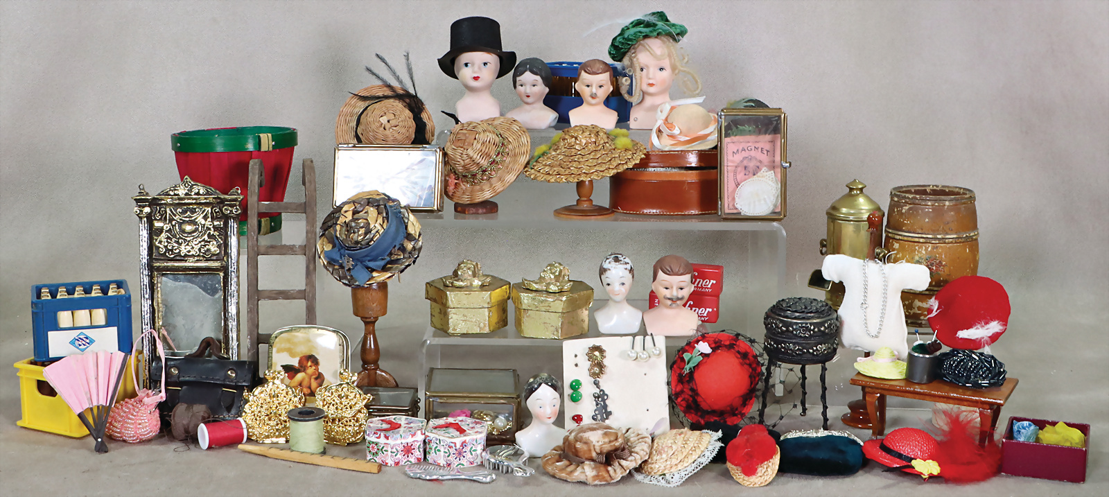 Gr. Konv. Kaufladen- oder Modeladenteile, Schachteln, Hüte, Dosen