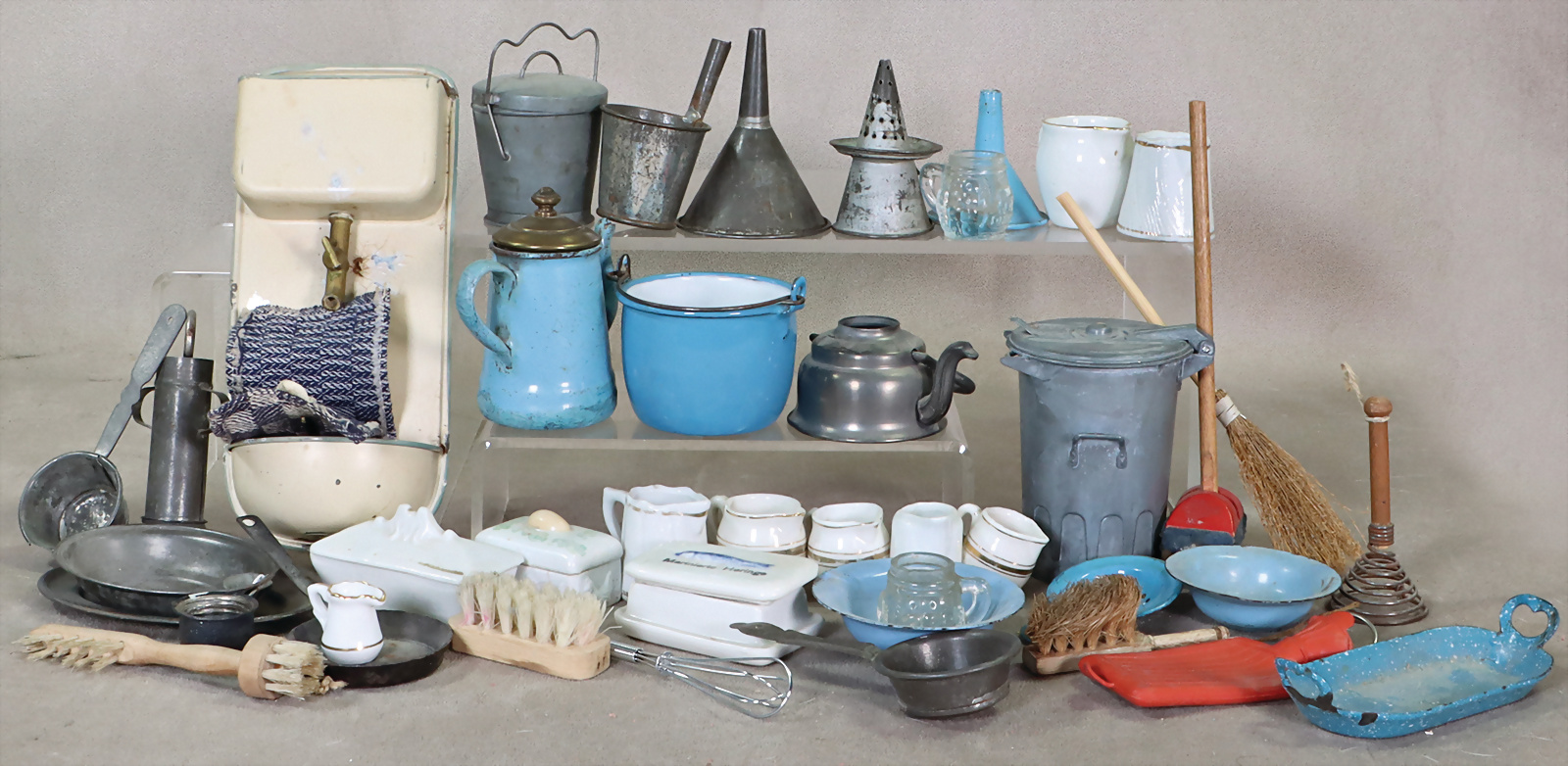 Konv. Puppenküchenteile, Blech, emailliert, Porzellan, Heringsdose, Eierdose, Kehrichteimer, Krüge, Sieb