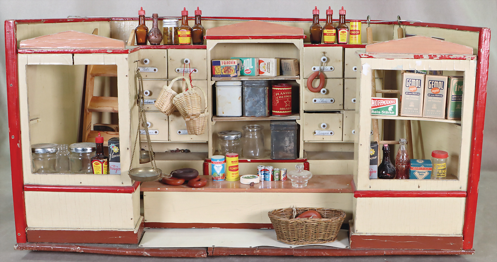 Kaufladen, ca. 1920, Schubladen mit Porzellan-Schildern, vorne 2 Schaufenster, 1x überstrichen, reichh. Zubehör, Schachteln, Dosen, Körbe, Gläser, untersch. Zeit