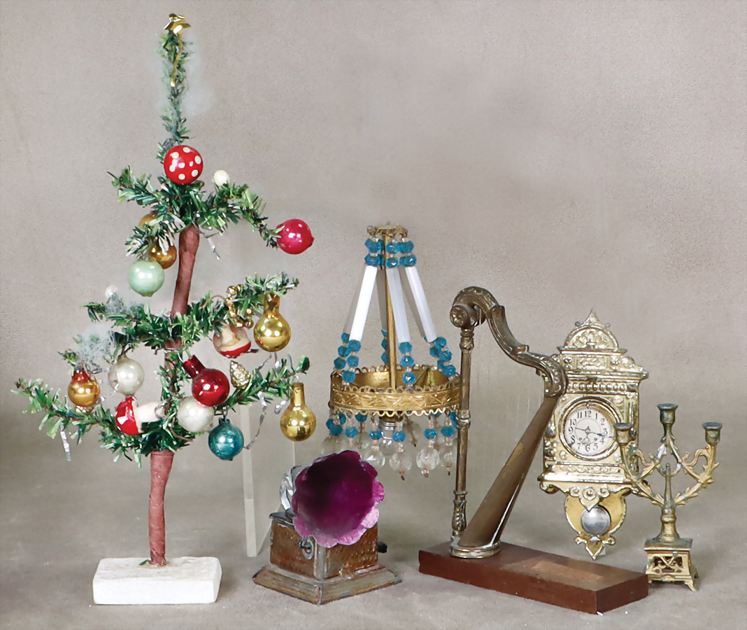 Puppenstuben-Ausschmückungsteile, Deckenleuchter, Messingblech, vergoldet, Glasperlen montiert, H: 10,5 cm, Wanduhr, Grammophon, Zinn, Leuchter, kl. Harfe, Metallguss, Puppenstuben-Weihnachtsbaum