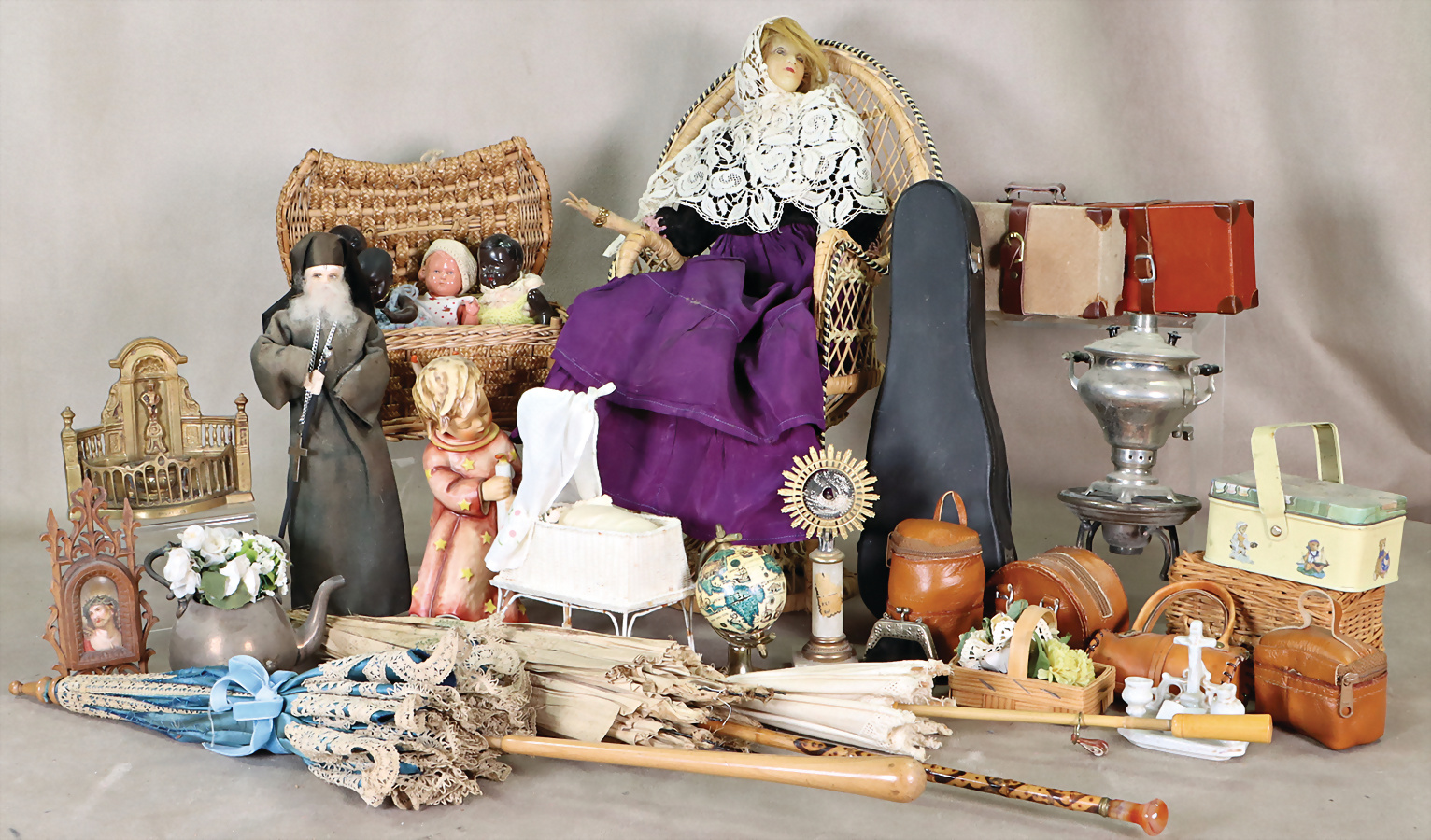 Puppen-Ausschmückungsteile, untersch. Zeit, einige Celluloid-Puppen, Wachspuppe, Alter?, Engelsfigur, GOEBEL, Taschen, Schirme, Kleinteile