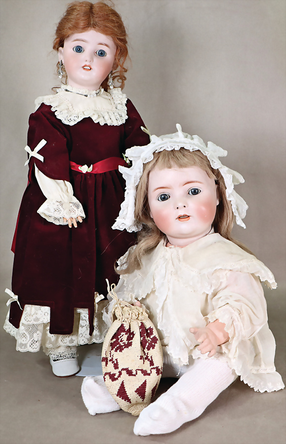 Konv. Puppen, Bergmann, SIMON & HALBIG, 7½, Porzellankopf-Puppe, 50 cm, Kurbelkopf, blaue Schlafaugen, off. Mund, oben Zähne, durchst. Ohren, Gliederkörper, Farbabweichung an den Händen, Kleidung u. Perücke neuer, ALT, BECK & GOTTSCHALK, 1367 45, Charakter-Baby, braune Schlafaugen, durchst. Nasenlöcher, off. Mund, Zähne u. Zunge, Sitzbaby-Körper, Echthaar-Perücke, Kleberreste am Kopfrand augenscheinlich keine Risse erkennbar, kann nicht richtig ausgeleuchtet werden