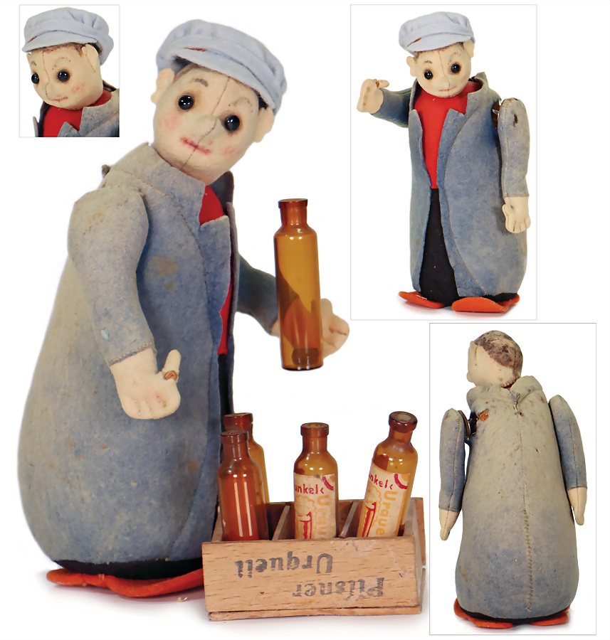 Engl. Filzpuppe, Filz-Presskopf, aufgesetzte Schuhknopfaugen, Lippen- sowie Wangenbemalung, wohl Darstellung eines Clowns, eingesetzte, orangefarbene Mohairhaare, etwas eingestaubt, aufgesetzte Filzohren, Trikotkörper, bewegliche Arme u. Beine, Baumwollkleidung, 38 cm, um 1925