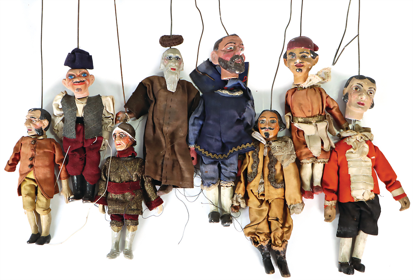 Konv. Marionetten, Böhmen, 12-27 cm, Masse-Köpfe, -Arme u. -Beine, teilw. Holz-Arme u. -Beine, Köpfe teilw. etw. angeschlagen, 10 Teile