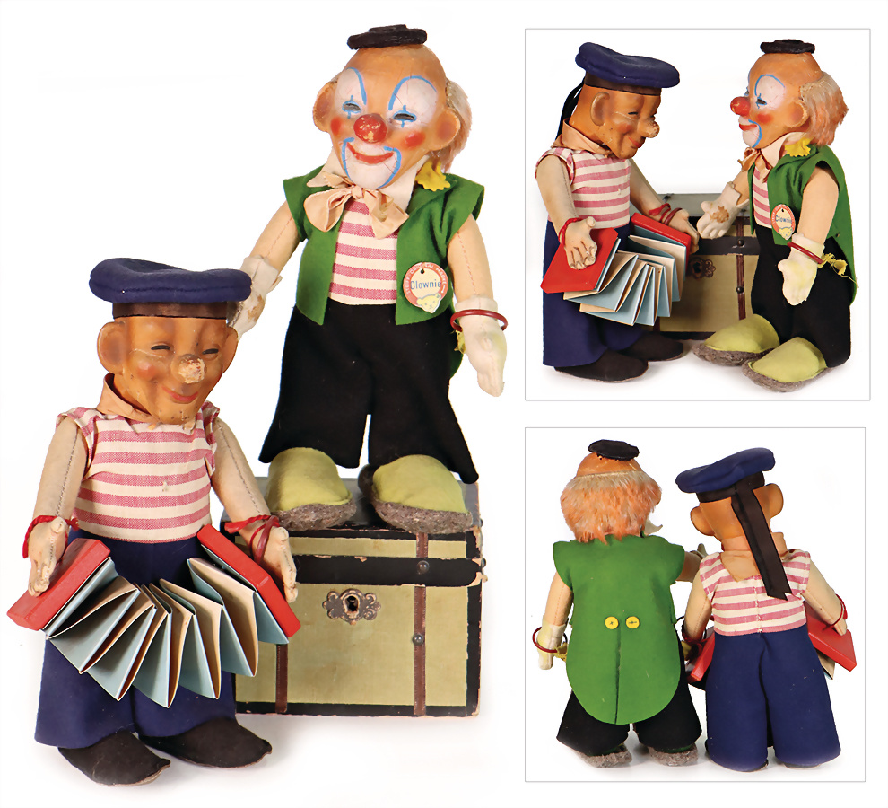 2 Teile 50er Jahre, 1 x Clownie, mit Knopf, Schild und Fahne, Vinyl-Kopf, kl. Rissbildung im Gesicht, bespielte Fahne, kleine Fehlstelle an der Hand, Filzsohlen überarbeitet, 1 x Mat, Seemann, Vinyl am Kopf gebrochen, Filzkörper, mit Knopf und gelber Fahne, Nummer auf der Fahne 119