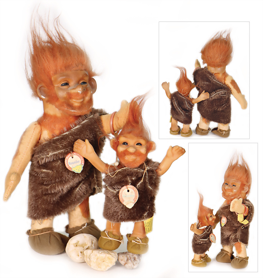 2 Teile Neander, 1 x Neander, mit Knopf, Schild und Fahne, Nr.: 7755/13, Vinyl-Körper, 13 cm, 1 x Neander, mit Knopf, Schild und Fahne, Nr.: 7755/19, Vinyl-Kopf, Filzkörper, 20 cm, Zustand gut