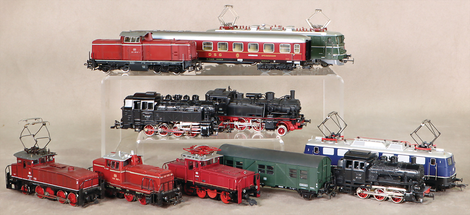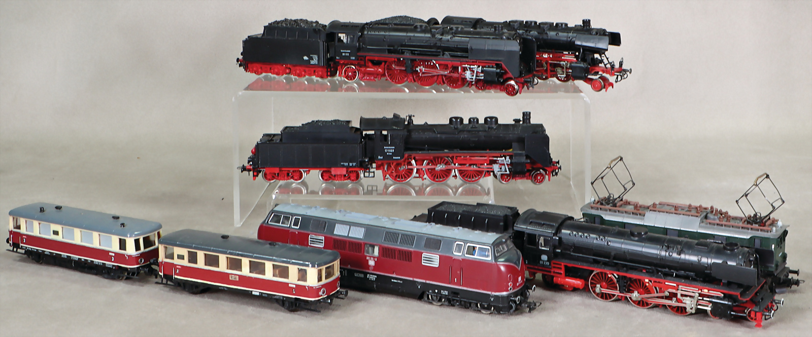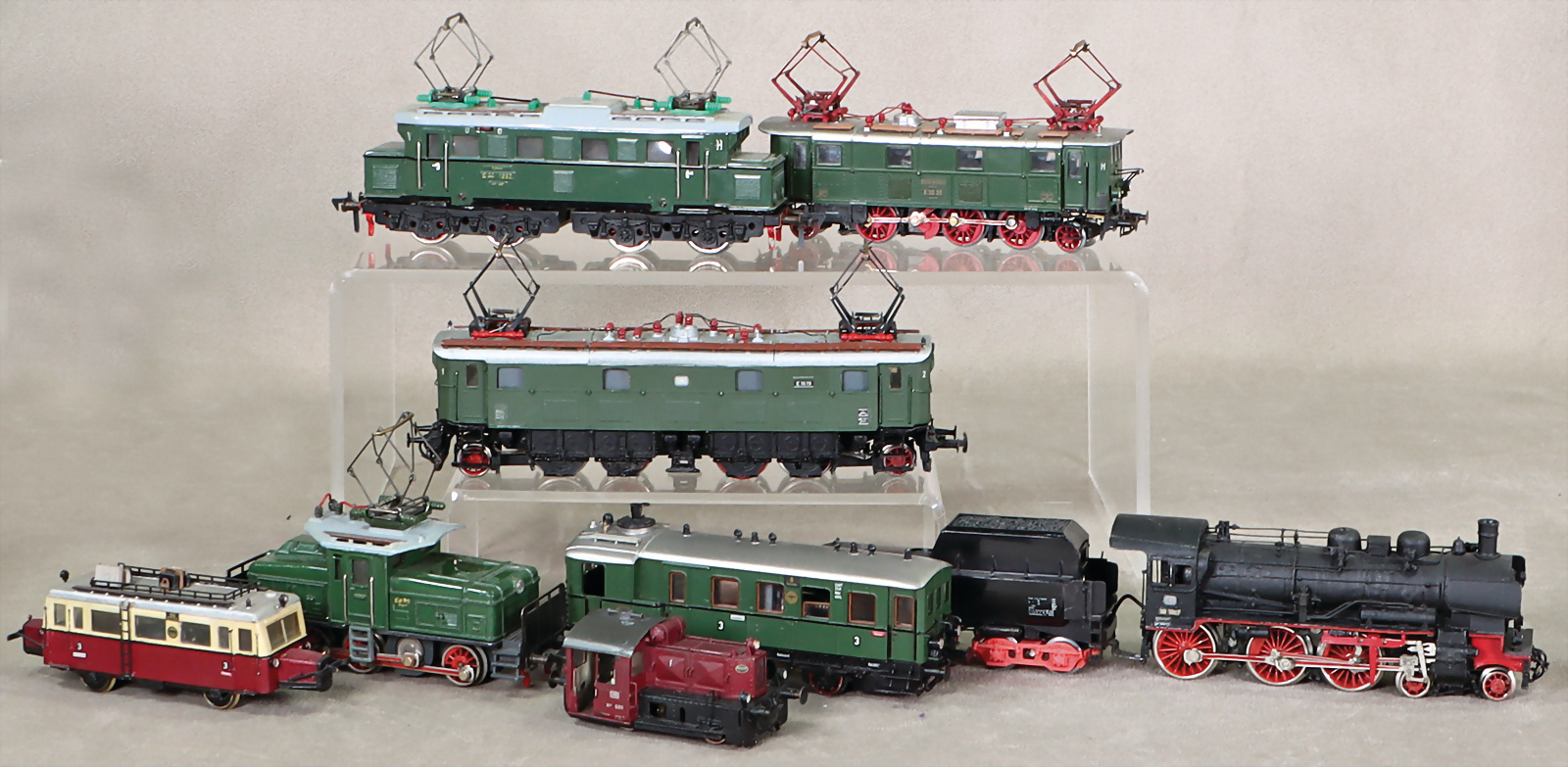 Konv. H0, Lokomotiven, 4x Schlepptender-Lok, 1 Triebwagen, 1x Diesel-Lok, 1x Elektro-Lok, leicht bespielt-guter Zust., ohne Kart., techn. nicht gepr.
